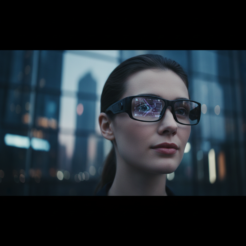 Un mannequin portant des lunettes connectées élégantes et sombres avec une superposition numérique subtile et lumineuse visible sur une lentille, représentant une interface utilisateur graphique.